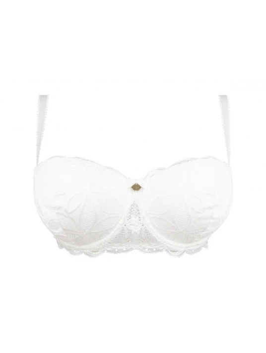 -Soutien-gorge forme bandeau aux bonnets mi-couvrants (de type corbeille) formant un décolleté horizontal façon bustier superbement habillé d’un empiècement de dentelle/résille graphiques pour un glamour assumé. Le soutien-gorge parfait pour une robe estivale à dos nu puisqu’il vous permet de dissimuler ses bretelles pour des épaules à couper le souffle.