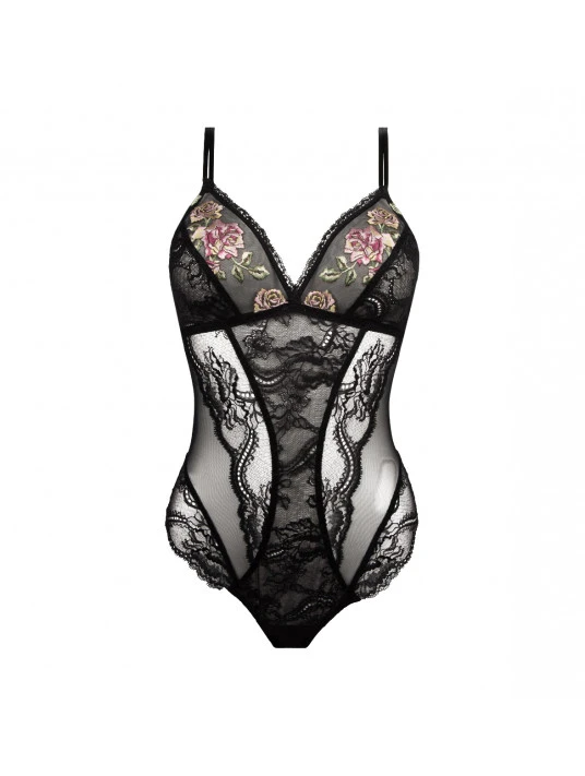 Body sexy avec un jeu de découpes en tulle et dentelle Leavers venant élancer la silhouette. Les bonnets sont en laize dentelle et tulle multibrins brodés de motifs floraux multicouleur, soulignés au décolleté par un petit galon dentelle. Le bas, en dentelle Leavers festonnée est échancré aux cuisses