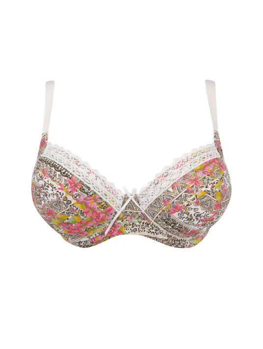 Soutien gorge souple à armature avec départ bretelle tout en maille. Bretelle élastique en continue. Un dos cheminé pour un meilleur maintient. Une dentelle festonnée souligne le décolleté. Un nœud satin long pans orne l’entre gorge.