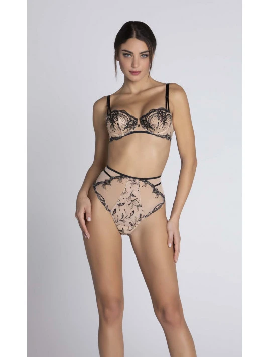 Devant en laize brodée doublé nude. Galons brodés festonnés sur les côtés avec jeu de barrettes.Finition cuisses en galon brodé festonné. Dos sublimé par un motif brodé ajouré. Forme string.Taille bordée noir.
