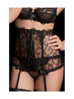 Jarretelles satinées réglables. Laçage sur le milieu devant et dos en tulle. Délicat galon brodé et un nœud de satin.