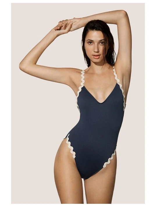 Drew est une collection confectionnée dans un tissu crêpé espagnol, à base de fibres recyclées certifiées GRS*, à la texture douce et au séchage facile. Elle s’accompagne d’un détail décoratif contrastant qui lui confère tout son caractère : une broderie en forme d’ondulation qui évoque la mer, techniquement connue sous le nom de Rick-Rack.