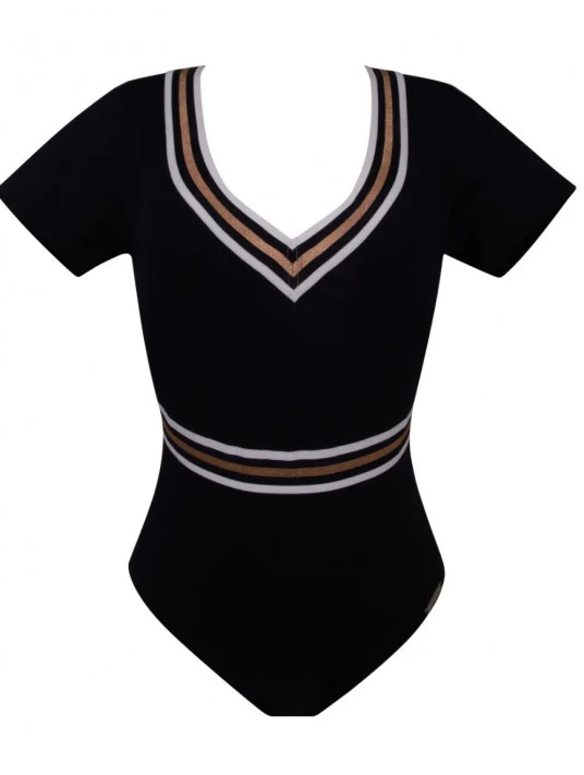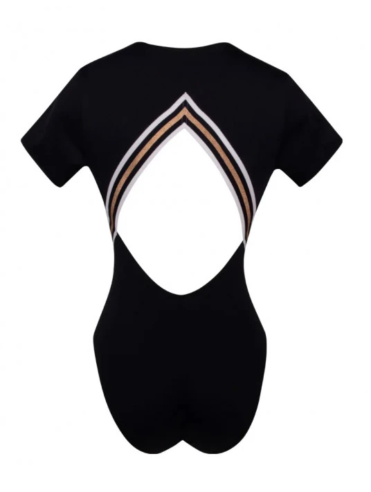 Un élastique graphique aux touches cuivrées souligne et affine la silhouette en sublimant le décolleté devant et dos ainsi que la taille .
