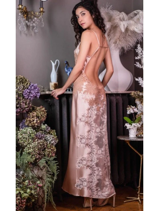 Nuisette longue Nina ornementée sur son décolleté d’une délicate dentelle incrustée à la main qui révèlera subtilement votre poitrine. Son dos nu révèle avec sensualité une chute de reins vertigineuse embelli par l’incrustation de dentelle.