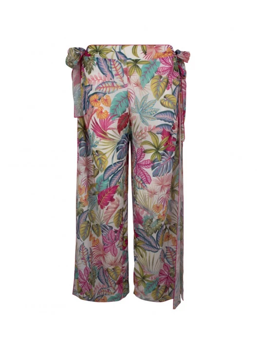 Pantalon en voile imprimé. Effet paréo avec ouvertures sur les côtés.