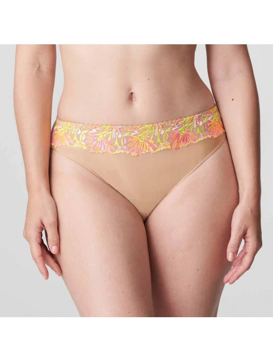Slip brésilien coloré avec une ceinture en broderie à la taille.