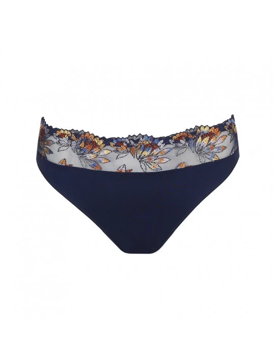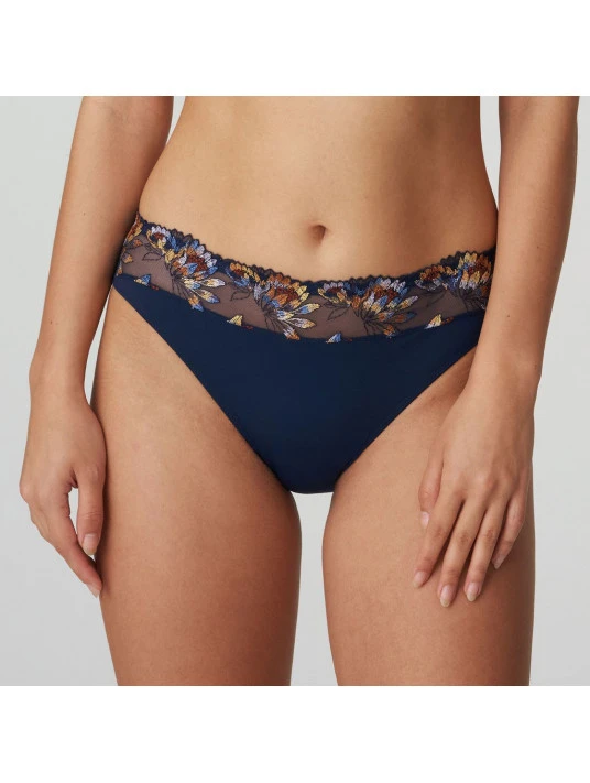 Slip classique ou brésilien avec broderies colorées et élégant galon de dentelle sur le devant.