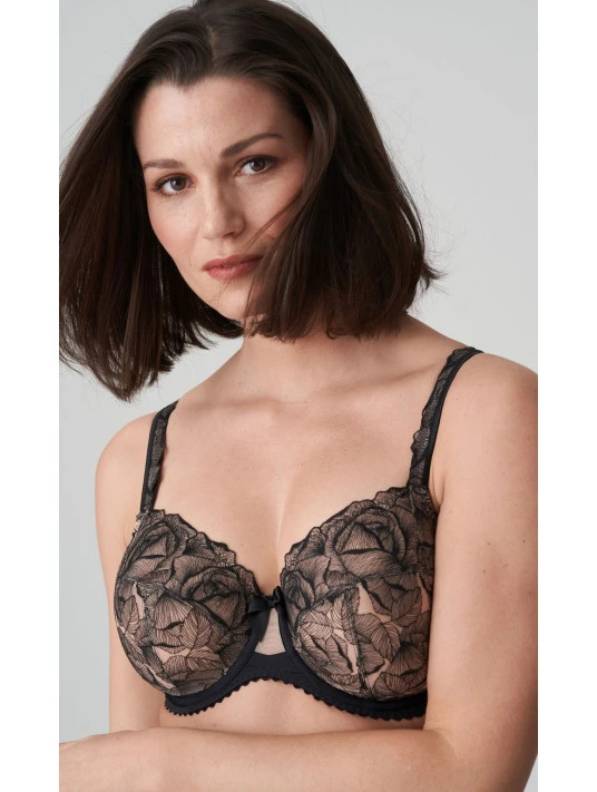 Un soutien-gorge à armatures sensuel en voile brillant orné de roses brodées et stylisées.