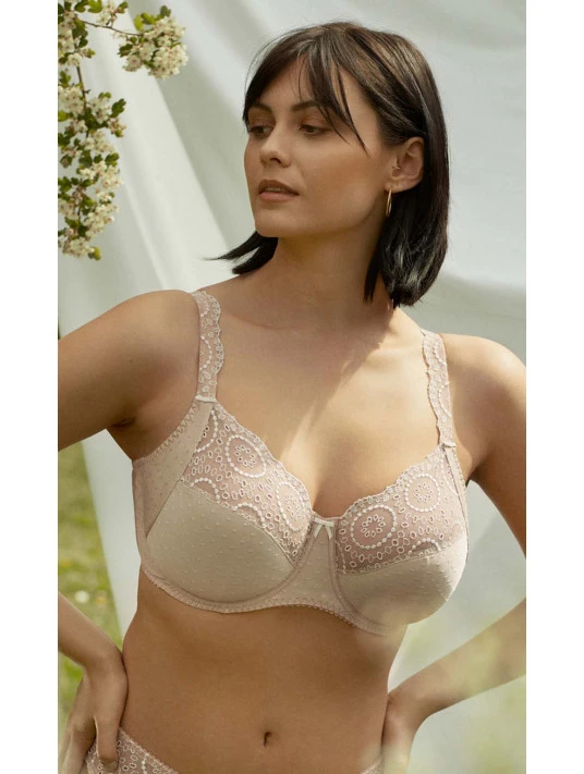 Le soutien-gorge est élégant et est orné d’une broderie anglaise au niveau des bretelles et sur le haut des bonnets.