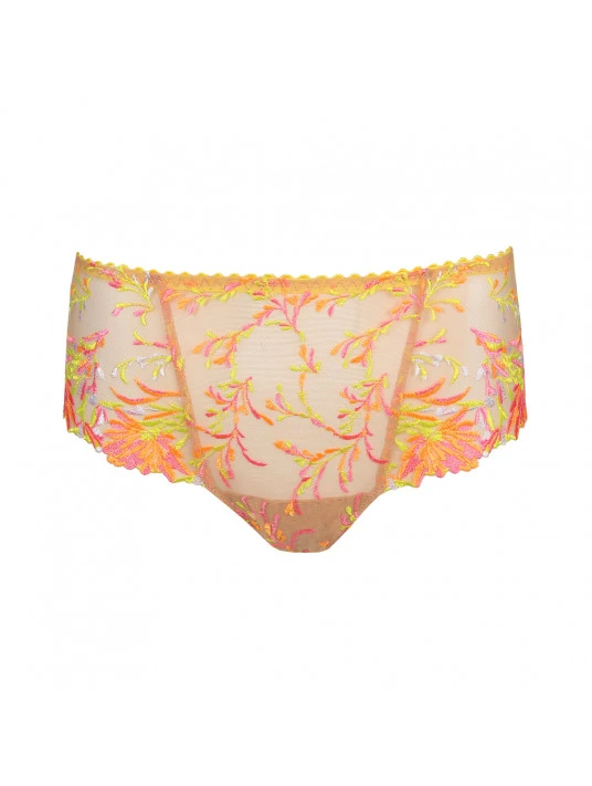 Féminin et estival : le string luxueux affichant une broderie aux couleurs flashys.