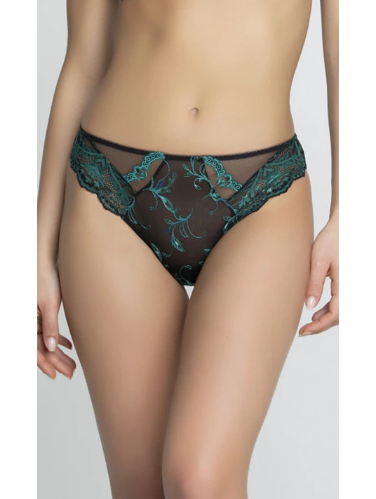 Les fils dans les tonalités de vert et de bleu cobalt réhausse le fond noir intense. Les formes allégées avec des effets d’ajourages et de transparence dévoilent les courbes avec sensualité.