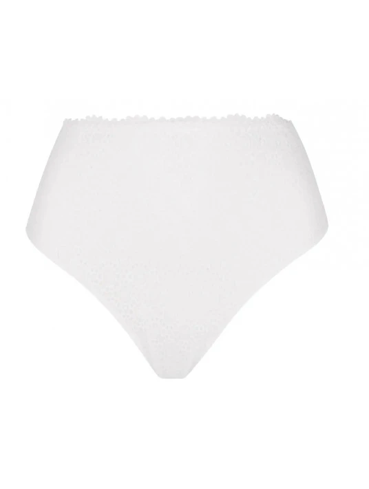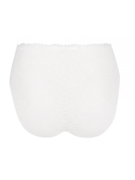 Slip haut tout en dentelle, doublé devant avec petite bordure fantaisie à la taille.