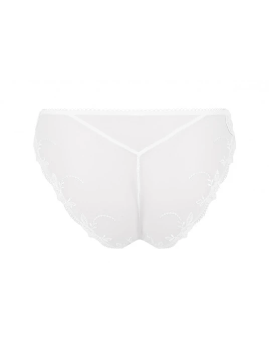 Devant en tulle brodé et motifs guipure aux côtés. Empiècements devant et cuisses dos en broderie festonnée. Triangle dos en tulle. Elastique fantaisie à la taille.