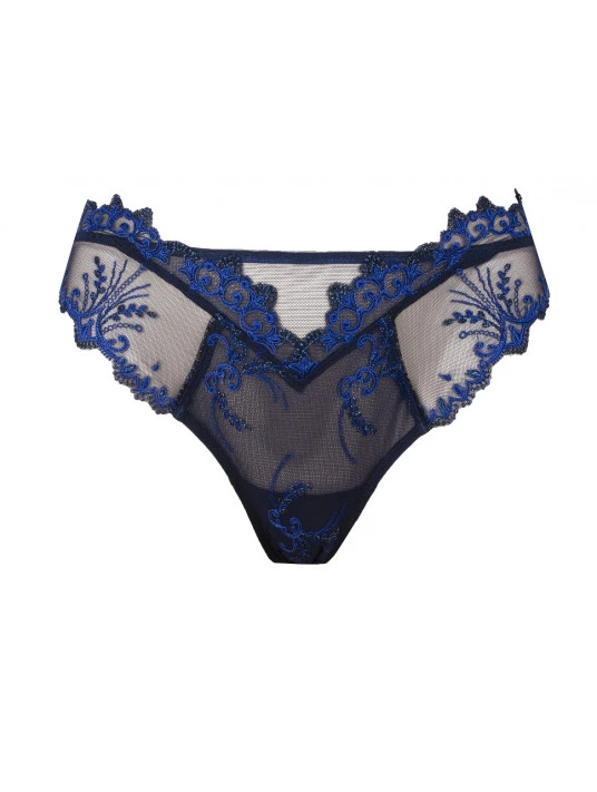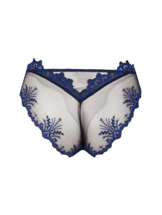 Un slip séduction sublimé d’une broderie luxueuse, aux motifs de feuillages avec de fines étoiles filantes et de délicates chainettes bijoux, décliné dans des éclats de lumière bleue.