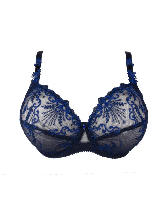 Un soutien-gorge avec armatures bien-être sublimé d’une broderie luxueuse, aux motifs de feuillages avec de fines étoiles filantes et de délicates chainettes bijoux, décliné dans des éclats de lumière bleue.