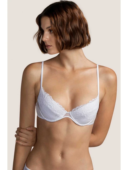 Soutien-gorge rembourré de la collection TYNG par Andres Sarda Soutien-gorge push-up à bonnets amovibles. Même dentelle et pièces intermédiaires subtiles en tulle transparent sur la poitrine et le dos. Disponible dans les tailles de bonnet B à D. White, une couleur intemporelle et pleine de fraîcheur, qui met parfaitement en valeur la dentelle. Les pièces intermédiaires en tulle sont ici de couleur blanche.