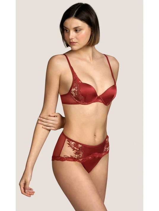 Soutien-gorge rembourré - Andres Sarda – Collection Cooper . Soutien-gorge rembourré décolleté profond. Bonnet et bretelles tout en soie. Broderie motif cachemire sur la partie supérieure. La couleur luxury red est un rouge ton sur ton, probablement la combinaison la plus luxueuse de toute la collection.