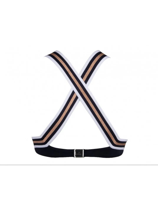 Triangle en maille unie tonique certifiée Lycra Sport. Un élastique graphique aux touches cuivrées souligne la silhouette sous la poitrine et aux bretelles. Mousses amovibles. Bretelles larges pour un meilleur confort.