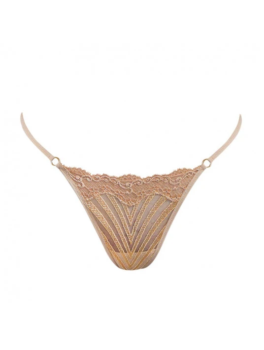 String d’une grande beauté grâce à l’emplacement des broderies, à la dentelle le long de la taille et aux anneaux dorés sur les côtés.