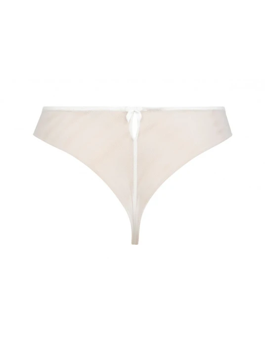 Dos en tulle doux avec petite ouverture ornée d’un nœud satiné dans le creux des reins.