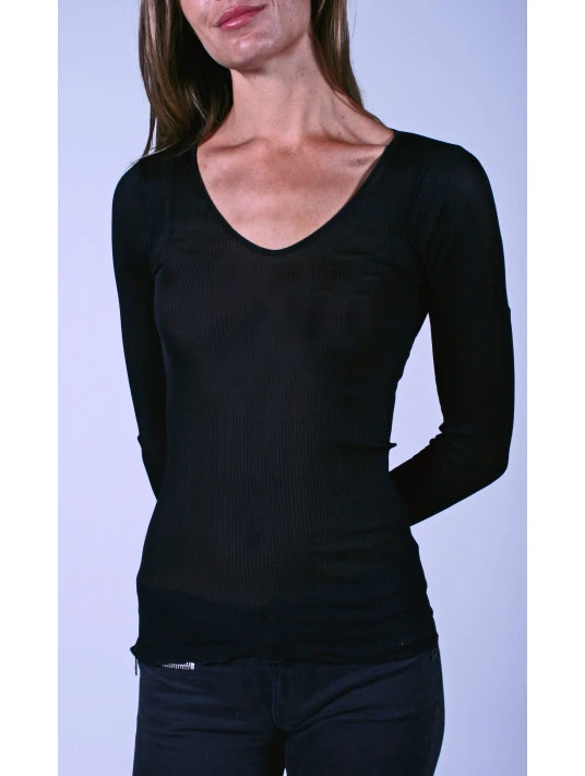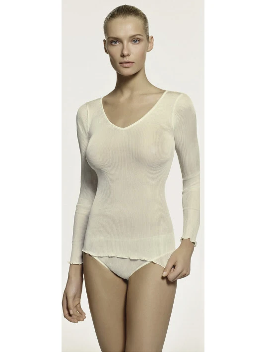 Chemise à manches longues et col V en organza de pure soie. Toucher ultra doux et sans coutures latérales pour un maximum de confort