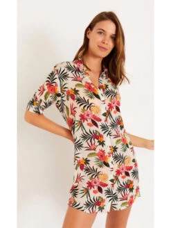 Cette chemise de plage en viscose fluide imprimée de fleurs japonisantes sur fond écrue NOLIE VOILLEVANTO est un parfait complément à votre maillot de bain.